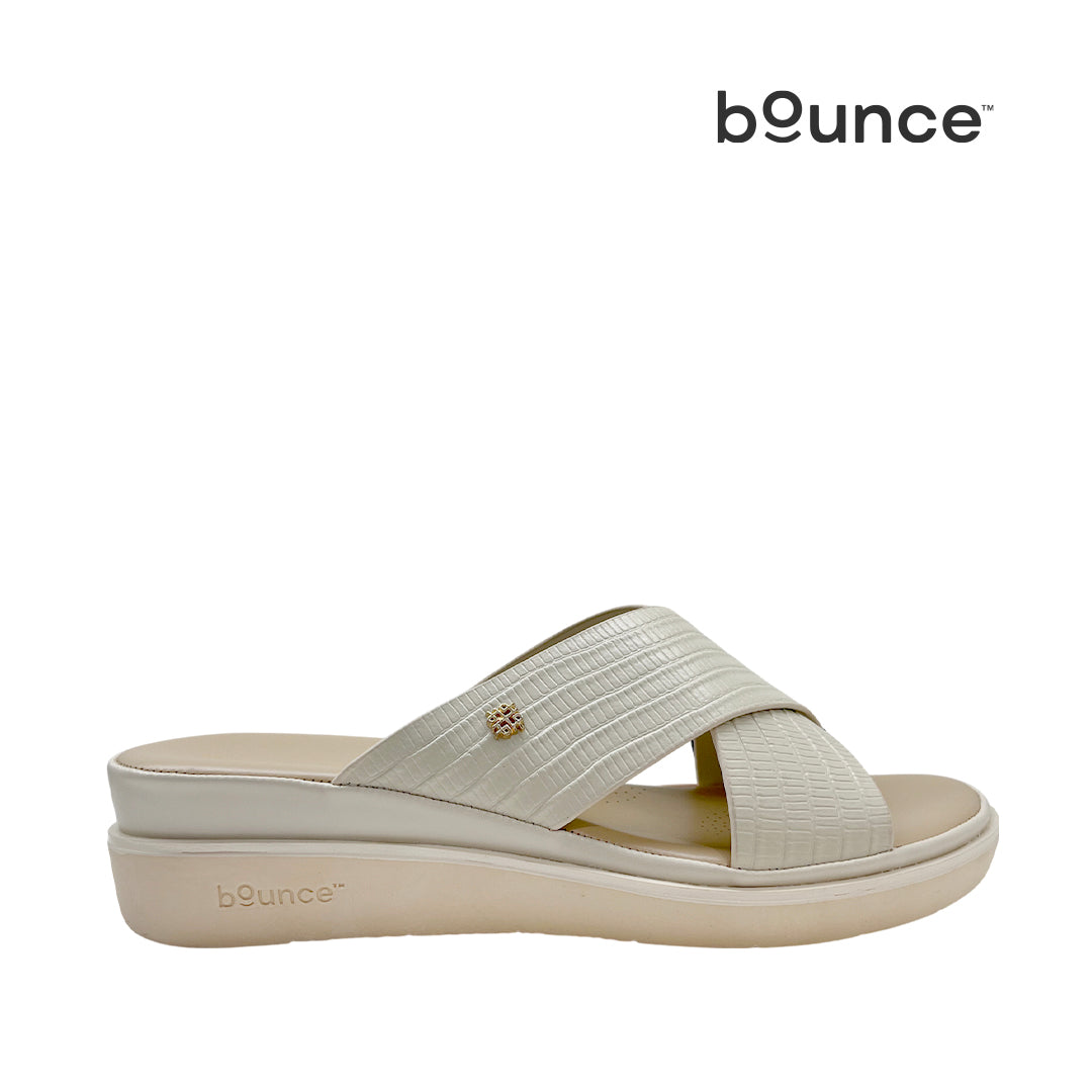 Sandalias flats Shasta para mujer color hueso, en cuero. Tecnología Bounce™ con plantilla extraíble de alta memoria que brinda rebote, recuperación de forma y comodidad todo el día.